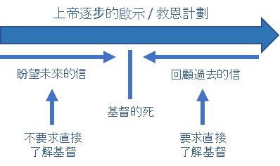 聖經明確地指出 , 對歷史中所有的人來說,信是救恩的關鍵 , 但是,在人們不知道基督為他們的犧牲時,神如何拯救人? 答案是 , 神拯救他們是根據他們對確有知識的回應。 他們的信盼望他們所看不見的東西 , 而如今 , 信徒回顧他們可以看到的事。 以下圖形描繪了這種理解 :